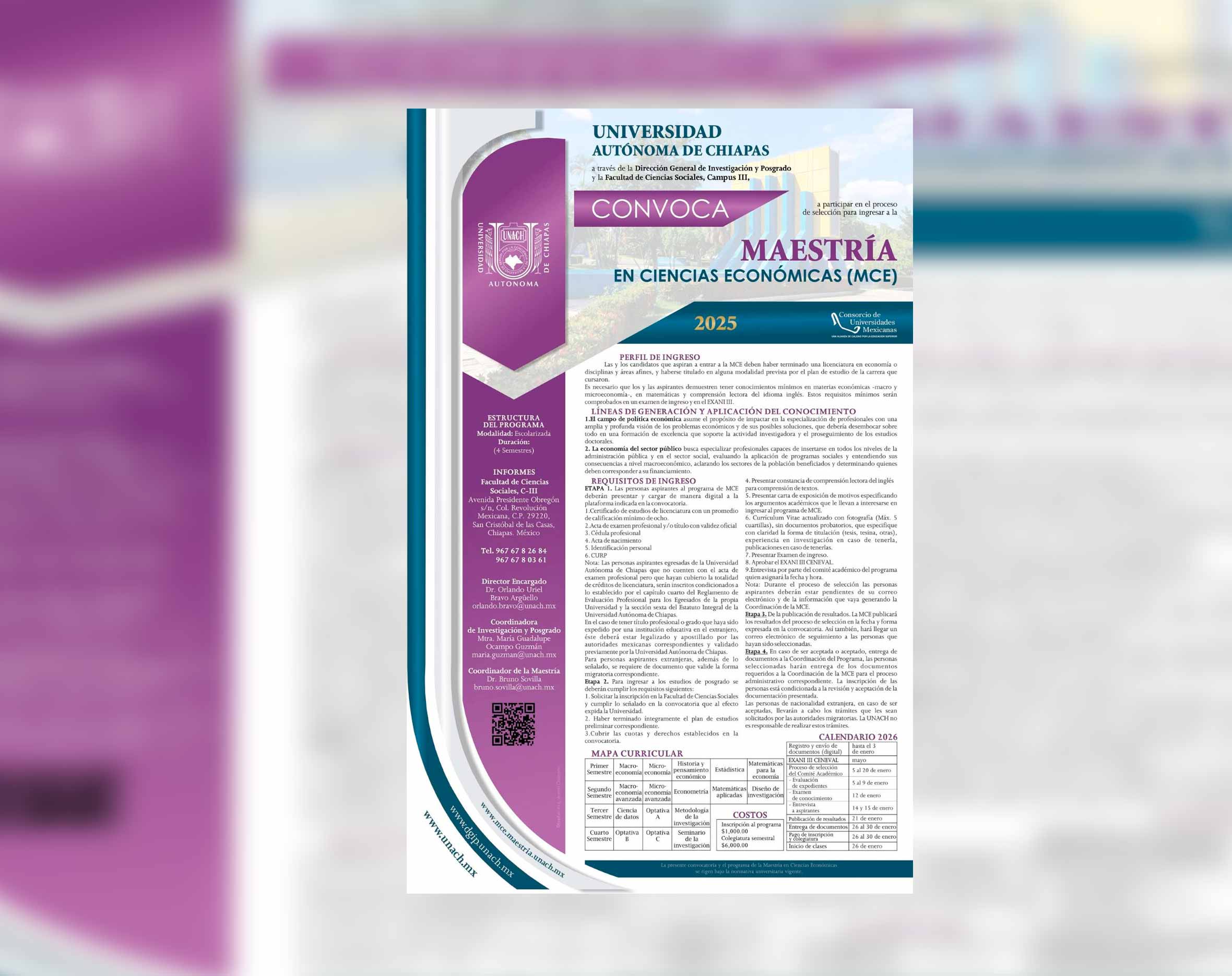 Tuxtla Gutiérrez, Chis., 07 DIC.-La Benemérita Universidad Autónoma de Chiapas invita a profesionales interesados en fortalecer sus capacidades analíticas y de investigación, a participar en la Convocatoria de Ingreso 2025 de la Maestría en Ciencias Económicas (MCE).