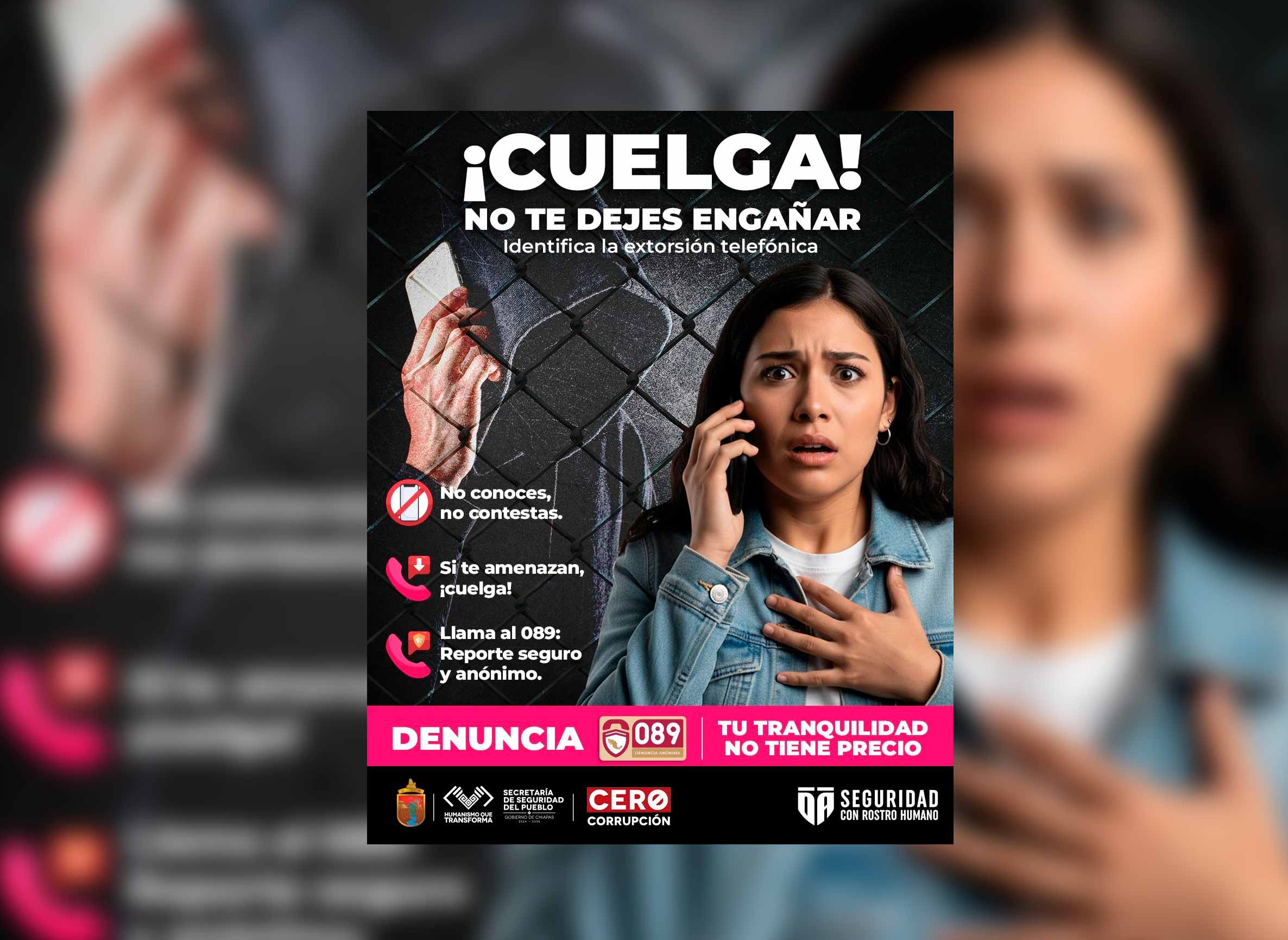 Tuxtla Gutiérrez, Chis., 27 FEB.-La Secretaría de Seguridad del Pueblo (SSP), alerta a la ciudadanía para tomar medidas de prevención y evitar ser víctimas del delito de extorsión telefónica.