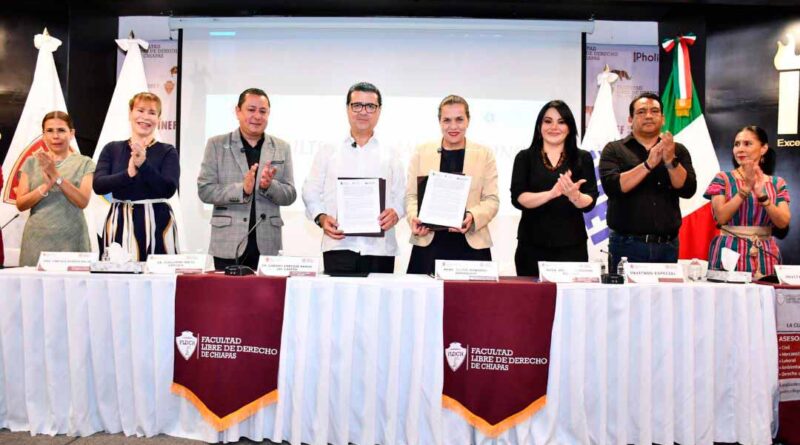 Tuxtla Gutiérrez, Chis., 16 ABR.-Por invitación de Gabriel Enrique Bravo del Carpio, rector de la Facultad Libre de Derecho de Chiapas (FLDCH), Ana Laura Romero Basurto, titular de la Secretaría Anticorrupción y Buen Gobierno (SAyBG), asistió a la inauguración de la Consultoría Legal de esta institución, un espacio académico con enfoque social que busca fortalecer la formación práctica de las y los estudiantes, así como brindar orientación jurídica gratuita a la población.
