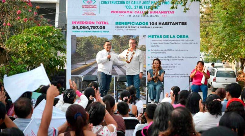 Tuxtla Gutiérrez, Chis., 24 MAR.-Desde la colonia 27 de Febrero en Tuxtla Gutiérrez, el secretario del Humanismo, Francisco Chacón, encabezó el arranque del programa Calles Humanistas con el inicio de la construcción de la calle José María Pino Suárez, una obra que responde a una de las principales demandas de las y los habitantes, contar con vialidades dignas y seguras.