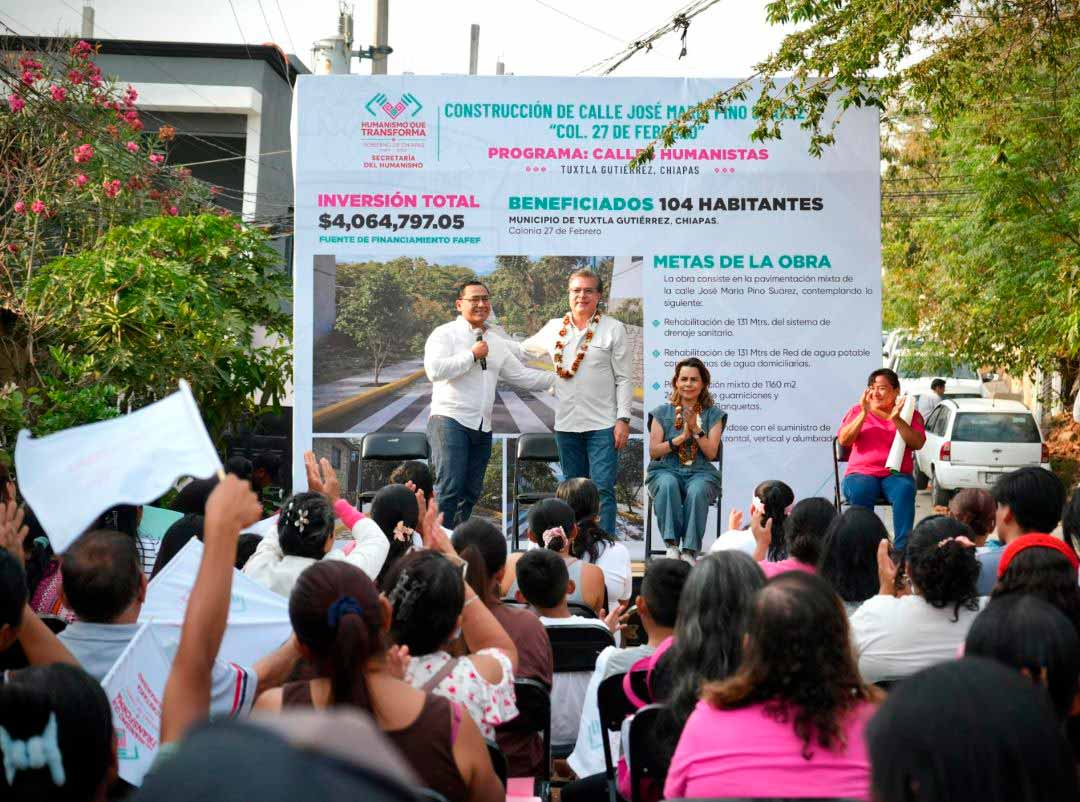 Tuxtla Gutiérrez, Chis., 24 MAR.-Desde la colonia 27 de Febrero en Tuxtla Gutiérrez, el secretario del Humanismo, Francisco Chacón, encabezó el arranque del programa Calles Humanistas con el inicio de la construcción de la calle José María Pino Suárez, una obra que responde a una de las principales demandas de las y los habitantes, contar con vialidades dignas y seguras.