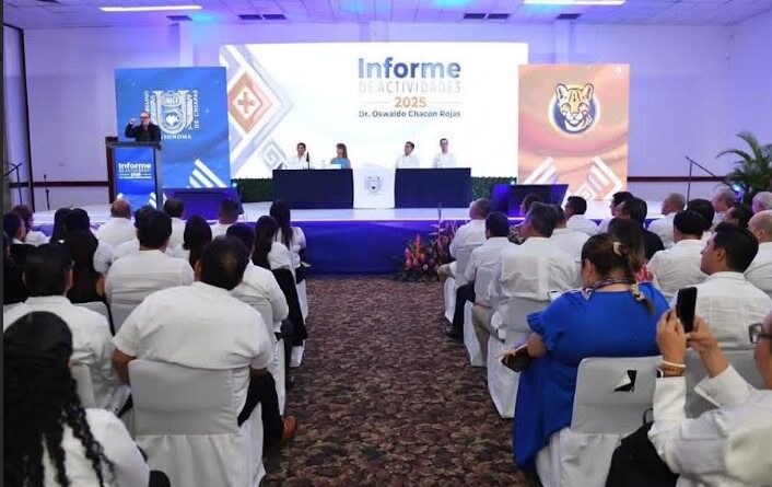 Tapachula, Chis. 16 DIC.-Durante este 2025, en el jubileo de sus 50 años, la Universidad Autónoma de Chiapas fue reconocida por el Congreso del estado, como Benemérita, a iniciativa del Gobernador Eduardo Ramírez Aguilar, recordó el rector Oswaldo Chacón Rojas, durante el informe de actividades 2025.