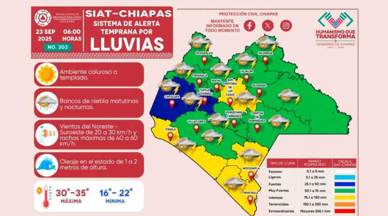 Tuxtla Gutiérrez, Chis, 23 SEP.-De acuerdo con el Sistema de Alerta Temprana por Lluvias (SIAT) que emite la Secretaría de