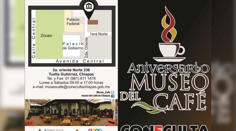 Tuxtla Gutiérrez, Chis., 15 AGO.-El Museo del Café de Chiapas está de fiesta y celebrará este viernes 18 de agosto su 8vo Aniversario con una nutrida programación cultural que iniciará a partir de las 10 de la mañana.