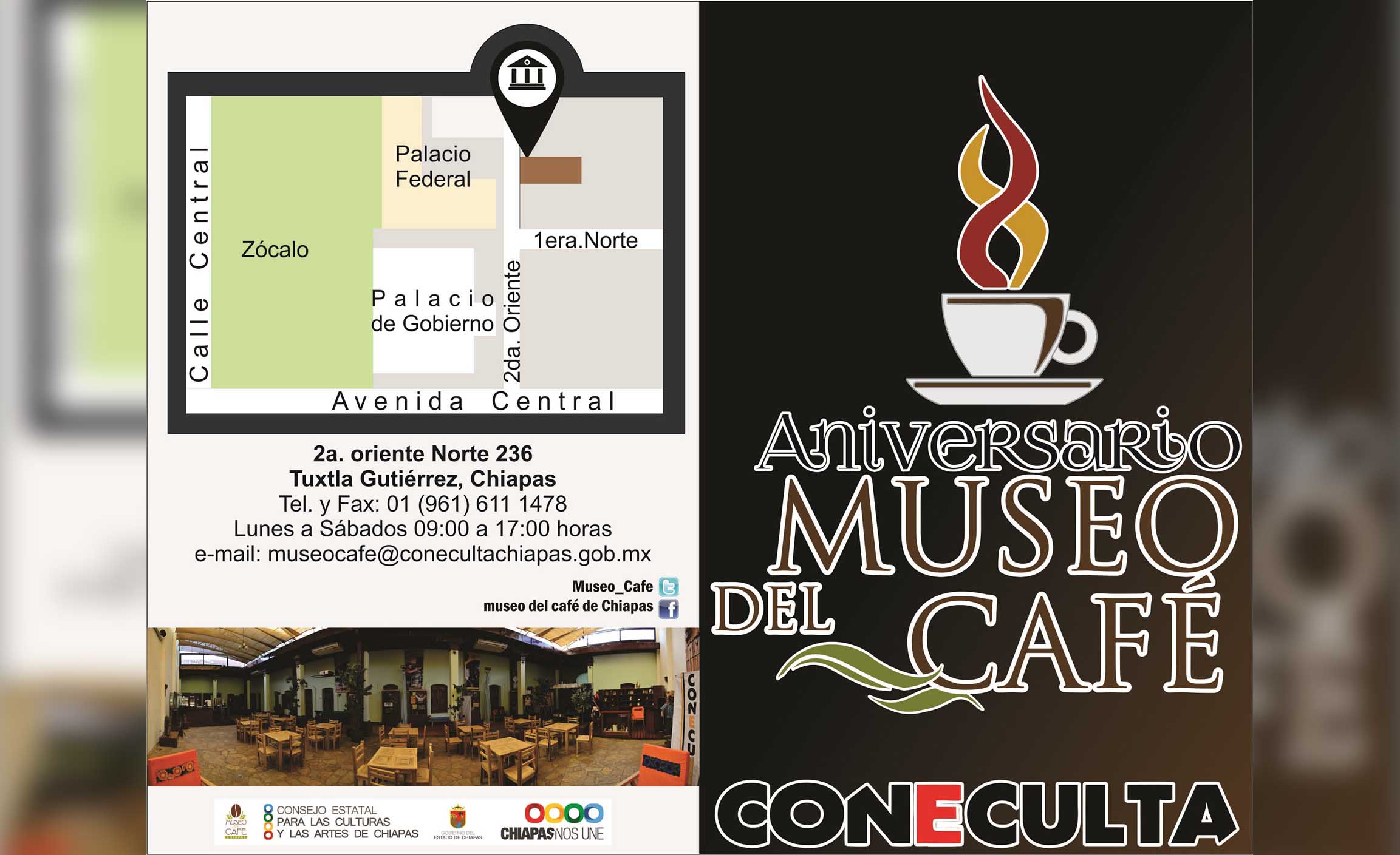 Tuxtla Gutiérrez, Chis., 15 AGO.-El Museo del Café de Chiapas está de fiesta y celebrará este viernes 18 de agosto su 8vo Aniversario con una nutrida programación cultural que iniciará a partir de las 10 de la mañana.