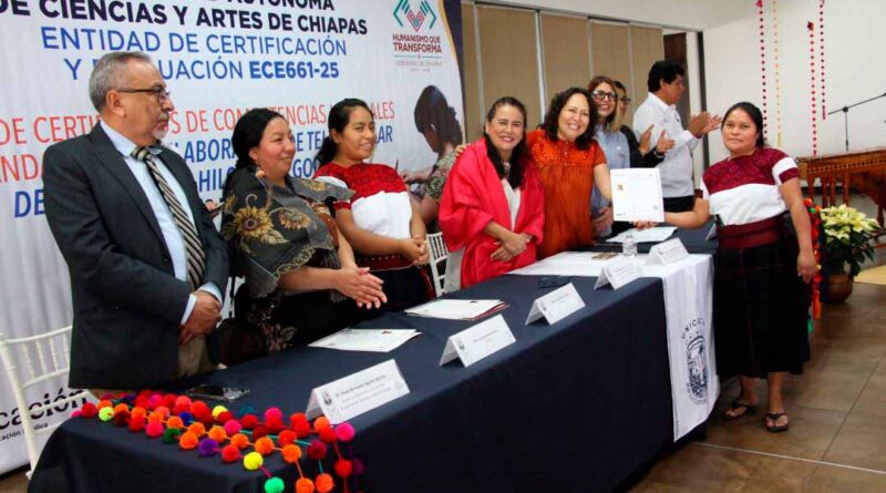 Resaltó, además, que la certificación incluyera a tres generaciones, desde las abuelas hasta las nietas, así como a hombres que trabajan los textiles que reflejan la iconografía ancestral de los pueblos de Chiapas.