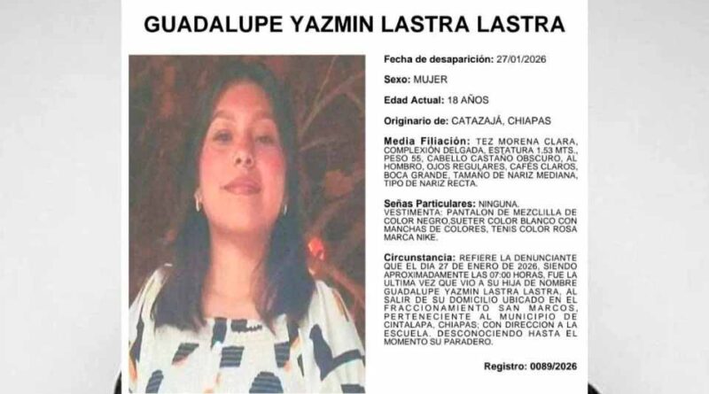Tuxtla Gutiérrez, Chis., 01 FEB.-La Fiscalía General del Estado (FGE) de Chiapas emitió una ficha de búsqueda para la localización de Guadalupe Yazmín Lastra Lastra, desaparecida el pasado 27 de enero en el municipio chiapaneco de Cintalapa.