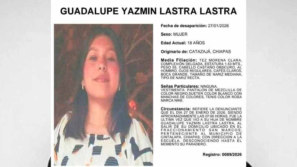 Tuxtla Gutiérrez, Chis., 01 FEB.-La Fiscalía General del Estado (FGE) de Chiapas emitió una ficha de búsqueda para la localización de Guadalupe Yazmín Lastra Lastra, desaparecida el pasado 27 de enero en el municipio chiapaneco de Cintalapa.