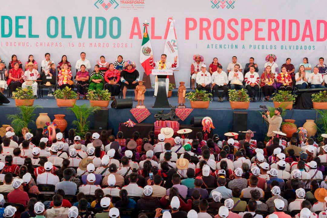 Oxchuc, Chis., 15 MAR.-El gobernador Eduardo Ramírez Aguilar encabezó la Declaratoria por la Prosperidad de los Pueblos Históricamente Olvidados, una estrategia integral mediante la cual distintas dependencias sumarán esfuerzos para atender las necesidades de 12 municipios con mayor rezago en la entidad. Este plan contempla programas y acciones en educación, salud, alimentación, medio ambiente, caminos, servicios básicos y productividad, entre otros rubros, con una inversión superior a 2 mil 694 millones de pesos prevista para el ejercicio 2026.