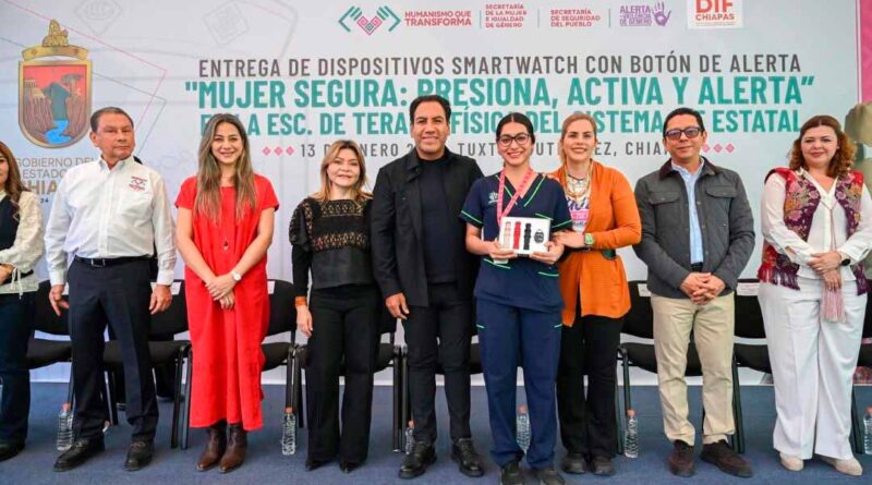 Tuxtla Gutiérrez, Chis., 13 ENE.-El gobernador Eduardo Ramírez Aguilar encabezó la entrega de dispositivos smartwatch con botón de alerta, enlazados al C5, como parte del programa Mujer Segura: Presiona, Activa y Alerta, dirigidos a estudiantes de la Escuela de Terapia Física del Sistema DIF Estatal. En este marco, destacó que una de las prioridades del gobierno de la Nueva ERA es garantizar la seguridad y el bienestar de las mujeres.