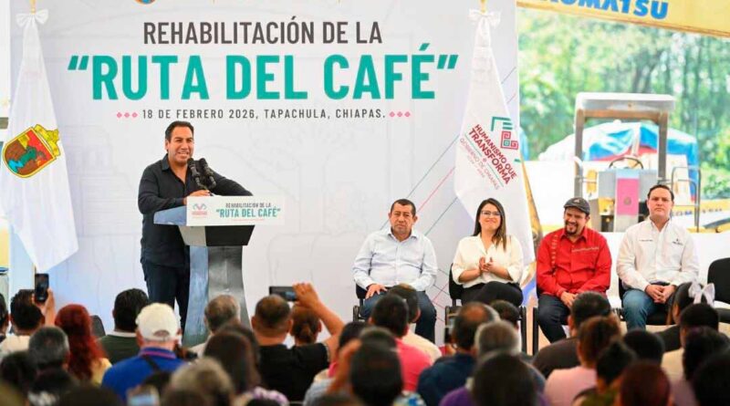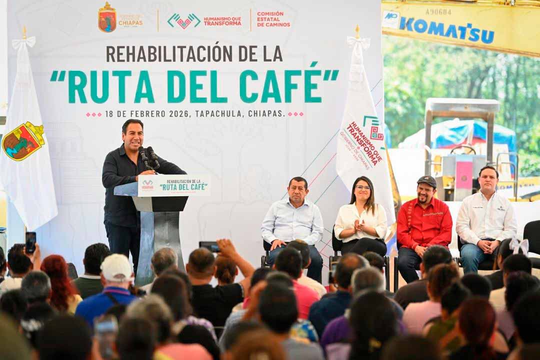 Tapachula, Chis., 18 FEB.-Durante una gira de trabajo por este municipio fronterizo, el gobernador Eduardo Ramírez Aguilar dio inicio a los trabajos de rehabilitación de la Ruta del Café, con una inversión superior a 40 millones de pesos en beneficio de más de 357 mil habitantes. En ese marco, destacó que una de las prioridades del gobierno de la Nueva ERA es impulsar el desarrollo social, económico y productivo de la Perla del Soconusco.