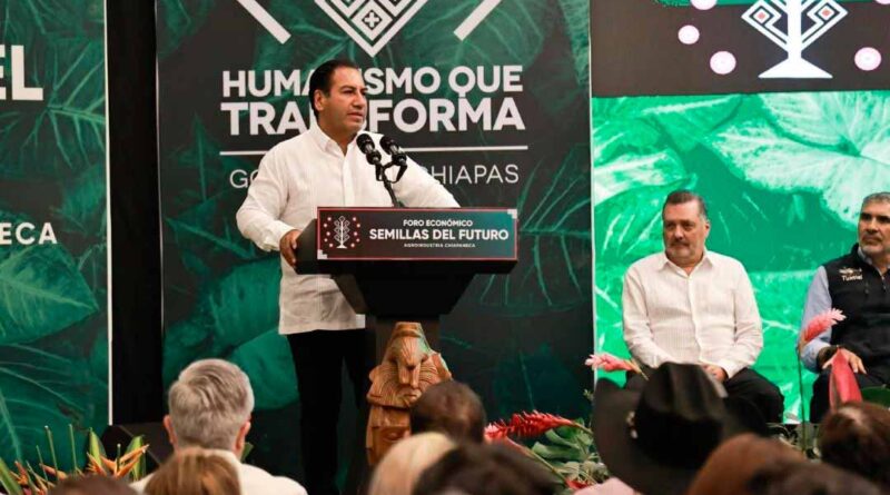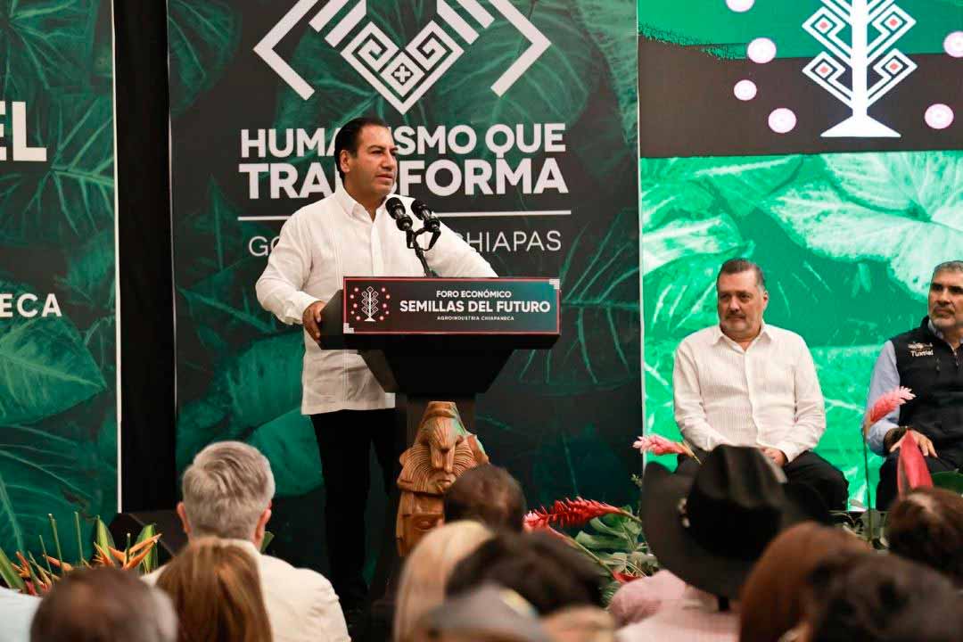Tuxtla Gutiérrez, Chis., 04 DIC.-El gobernador Eduardo Ramírez Aguilar asistió al Foro Económico Semillas del Futuro, donde reiteró el compromiso del gobierno de la Nueva ERA de fortalecer el sector agroindustrial mediante el impulso a las cadenas productivas en las distintas regiones, con el fin de promover el desarrollo social y económico de Chiapas.