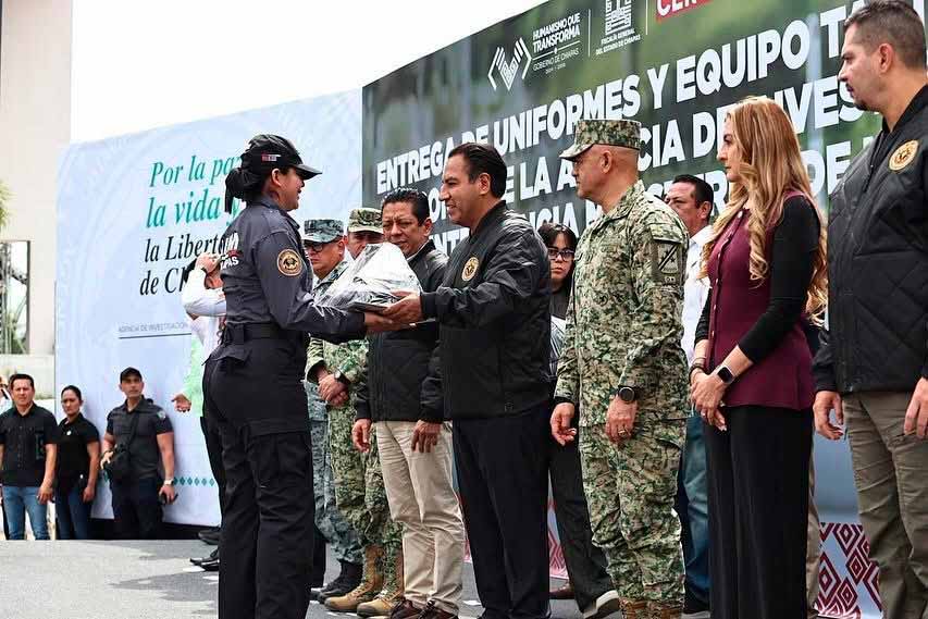 Tuxtla Gutiérrez, Chis., 14 NOV.-Durante la entrega de uniformes y equipo táctico al personal de la Agencia de Investigación e Inteligencia Ministerial (AIIM) de la Fiscalía General del Estado (FGE), el gobernador Eduardo Ramírez Aguilar, junto al fiscal Jorge Luis Llaven Abarca, subrayó que, gracias al trabajo de cooperación y coordinación con este organismo de procuración de justicia, con pleno respeto a su autonomía, en tan solo un año se ha logrado restablecer la seguridad y la paz anhelada por el pueblo.