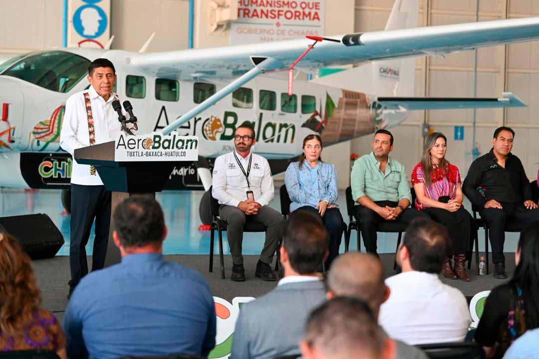 Más tarde, ambos mandatarios inauguraron el vuelo de AeroBalam que conectará a Tuxtla Gutiérrez con Oaxaca y Huatulco. Ramírez Aguilar afirmó que este paso amplía la conectividad entre Chiapas y el sur de México, y explicó que se trata de la primera ruta que se consolida hacia el exterior del estado. Añadió que la meta es abrir nuevos destinos hacia la Selva Lacandona, Veracruz, Guatemala y Houston.