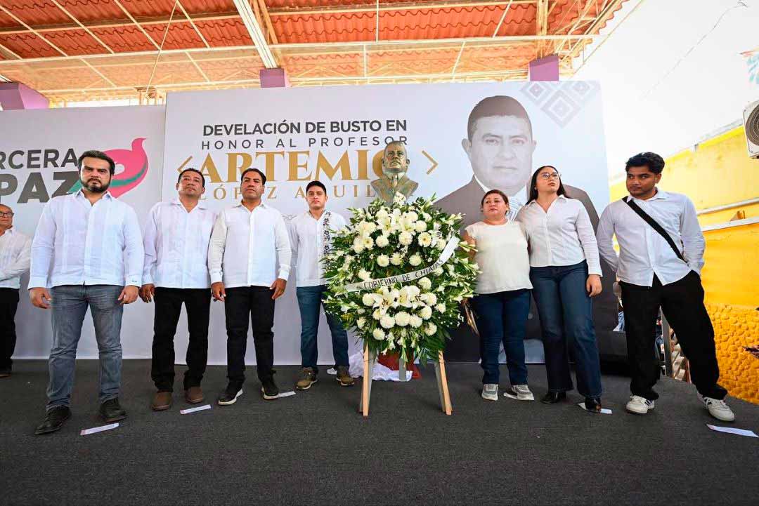 En este marco, presenció el homenaje y la develación del busto en honor al profesor José Artemio López Aguilar, a quien describió como un hombre humanista, digno, generoso y valiente, ejemplo de lucha por la justicia y la paz.
