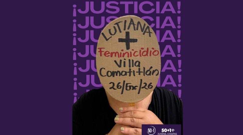 La Comisión a una Vida Libre de Violencia de las Mujeres de la Colectiva 50+1 Chiapas tuvo conocimiento la mañana de este lunes del feminicidio de Lutiania Marisela, de 35 años de edad, ocurrido en su domicilio del Cantón Ignacio Zaragoza, en el municipio de Villa Comaltitlán.