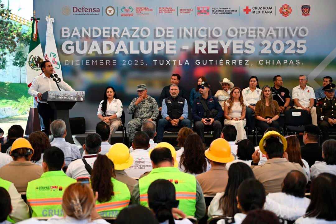 Tuxtla Gutiérrez, Chis., 01 DIC.-En el gobernador Eduardo Ramírez Aguilar dio el banderazo de inicio del Operativo Guadalupe-Reyes 2025. Señaló que el propósito es reforzar la coordinación entre las autoridades de seguridad y procuración de justicia, las Fuerzas Armadas, el sector salud, así como las instituciones estatales y municipales, con el fin de garantizar la tranquilidad y el bienestar de la población ante el incremento de la movilidad y las celebraciones decembrinas.