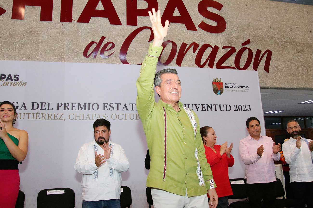 Tuxtla Gutiérrez, Chis., 26 OCT.-En la entrega del Premio Estatal de la Juventud Chiapas 2023, el gobernador Rutilio Escandón Cadenas felicitó y reconoció a las y los jóvenes galardonados por demostrar su talento, capacidad, sensibilidad y liderazgo comunitario a través del impulso de iniciativas, proyectos y estrategias en los ámbitos social, económico, político y cultural, que tienen como esencia contribuir al bienestar, el progreso y la transformación de Chiapas y de México.