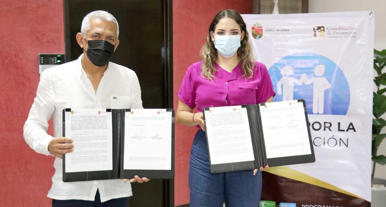 Tuxtla Gutiérrez, Chis., 30 MAR.-Con el objetivo coordinar acciones conjuntas para impulsar la participación ciudadana y la prevención entre la población chiapaneca, el titular de la Fiscalía General del Estado (FGE), Olaf Gómez Hernández y la directora del Instituto del Deporte del Estado (Indeporte), Tania Valeria Robles Velázquez, signaron un convenio de colaboración.