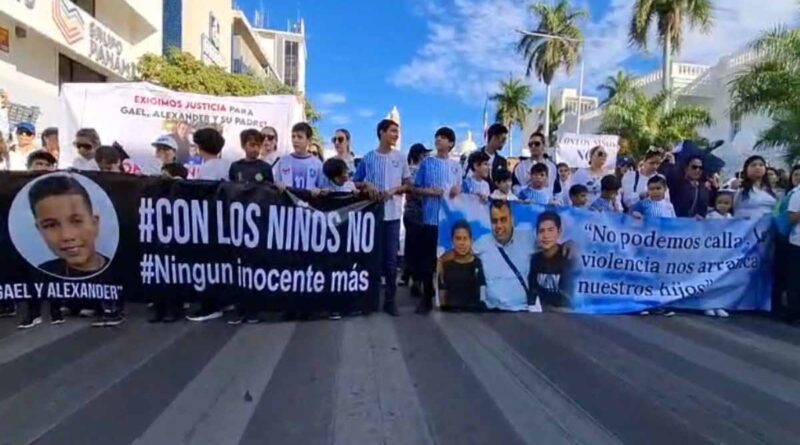 Culiacán, Sin., 23 ENE.-Ciudadanía, familiares, amigos y maestros de los niños Alexander y Gael Sarmiento Ruiz, así como de su papá, Antonio de Jesús Sarmiento, se manifestaron en Culiacán, Sinaloa, para exigir justicia por su asesinato y contra la violencia en la entidad.
