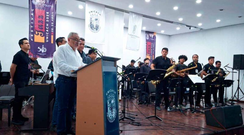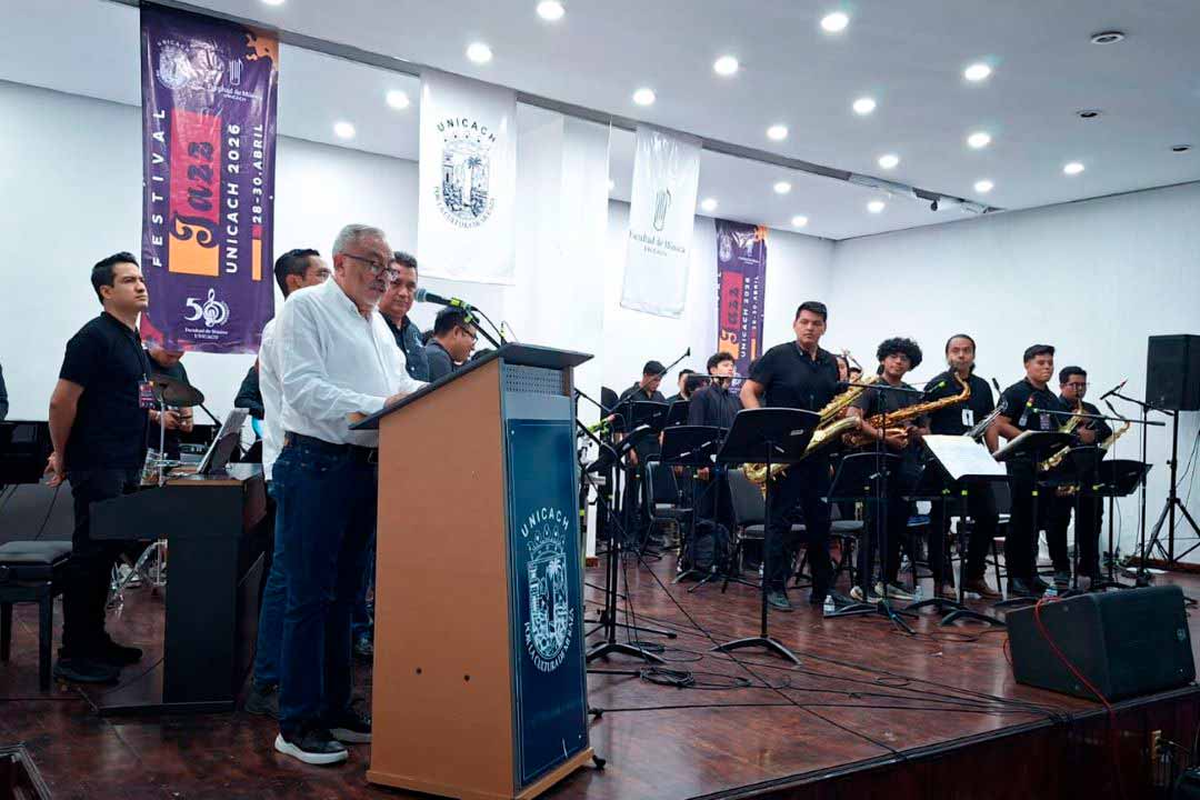 Tuxtla Gutiérrez, Chis., 28 ABR.-El Festival de Jazz UNICACH 2026 fomenta la vinculación de la Facultad de Música con otras instituciones y artistas, “proponiendo un espacio en el que los estudiantes de la Licenciatura en Jazz y Música Popular puedan tener contacto directo con creadores de su perfil diciplinar” consideró el secretario general de la Universidad Autónoma de Ciencias y Artes de Chiapas, Hugo Armando Aguilar Aguilar.