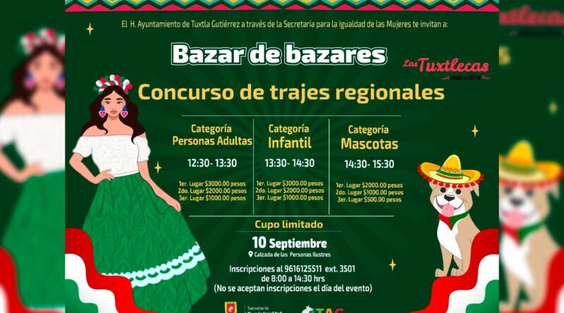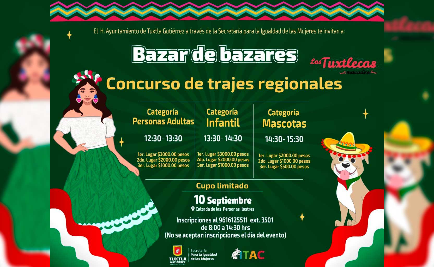 Asimismo, y referente al mes patrio, también se realizará dentro del “Bazar de bazares” el Concurso de trajes regionales, el cual tendrá tres categorías: Adultos, Niños y Mascotas; y los interesados se podrán inscribir al 961 61 255 11 extensión 3501, la dependencia informó que no se aceptarán inscripciones el día del evento.