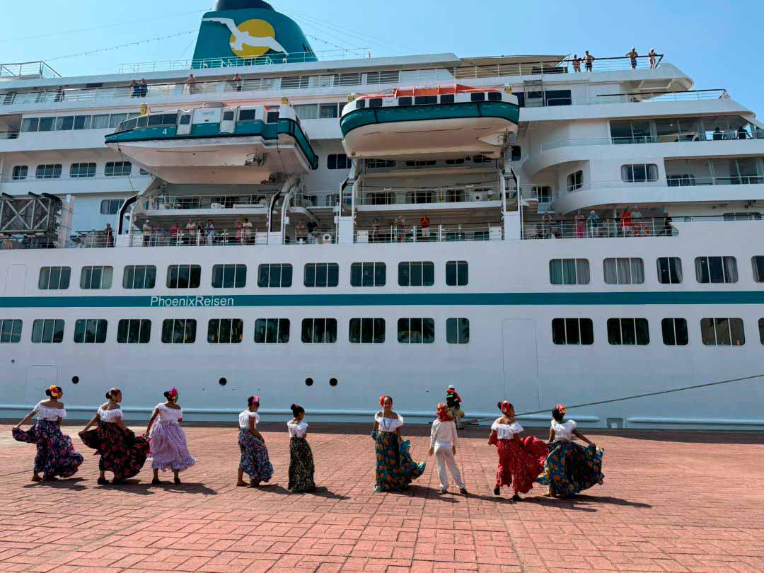 La embarcación arribó a territorio chiapaneco con más de 700 visitantes internacionales, entre 454 pasajeros y 306 tripulantes, quienes disfrutaron de una muestra cultural representativa de la identidad, con la participación del grupo de marimba del municipio de Tapachula y del ballet folclórico de Puerto Madero, San Benito.