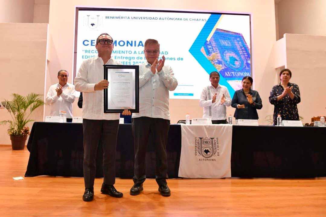Tuxtla Gutiérrez, Chis., 01 DIC.-El Coordinador General de los Comités Interinstitucionales para la Evaluación de la Educación Superior, Miguel Ángel Tamayo Taype, entregó al rector de la Benemérita Universidad Autónoma de Chiapas, Oswaldo Chacón Rojas, las acreditaciones de 44 programas educativos de 22 unidades académicas, en evento realizado en el auditorio Los Constituyentes, con lo que fue reconocida como la institución de educación superior del país con más programas acreditados en calidad en 2025.