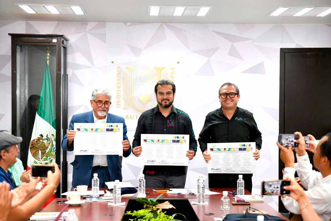 Tuxtla Gutiérrez, Chis., 22 FEB.-Se realizó el acto fundacional de la Red Latinoamericana de Educación en Interculturalidad (RLEI-UDUALC), cuya acta constitutiva fue firmada por el rector Oswaldo Chacón Rojas y el secretario general de la Unión de Universidades de América Latina y el Caribe, Roberto Escalante Semerena, teniendo como testigo de honor al secretario de Educación del Estado, Roger Adrián Mandujano Ayala.