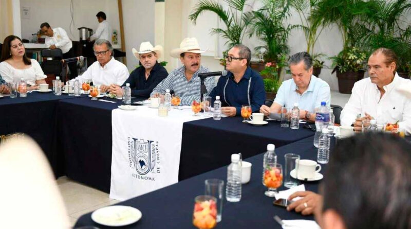 Tuxtla Gutiérrez, Chis., 25 AGO.-Con el objetivo de generar una mayor vinculación entre el sector productivo primario y la Universidad Autónoma de Chiapas, el rector Oswaldo Chacón Rojas y el secretario de Agricultura, Ganadería y Pesca, Marco Antonio Barba Arrocha, se reunieron con integrantes de las distintas organizaciones ganaderas del estado.