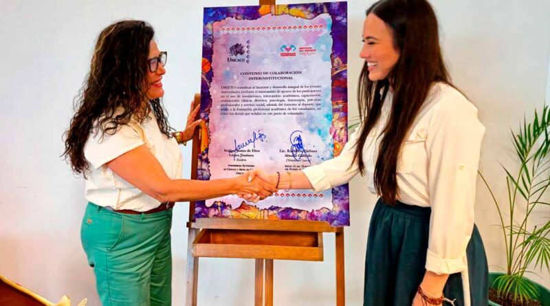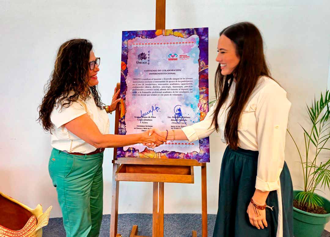 Tuxtla Gutiérrez, Chis., 23 MAR.-Con el objetivo de fortalecer la formación integral de las y los estudiantes y promover el desarrollo deportivo en la entidad, la rectora de la Universidad Autónoma de Ciencias y Artes de Chiapas (UNICACH), Fanny López Jiménez, y la directora del Instituto del Deporte del Estado de Chiapas (Indeporte), Bárbara Altúzar Galindo, firmaron un convenio de colaboración que consolida el trabajo conjunto entre ambas instituciones.